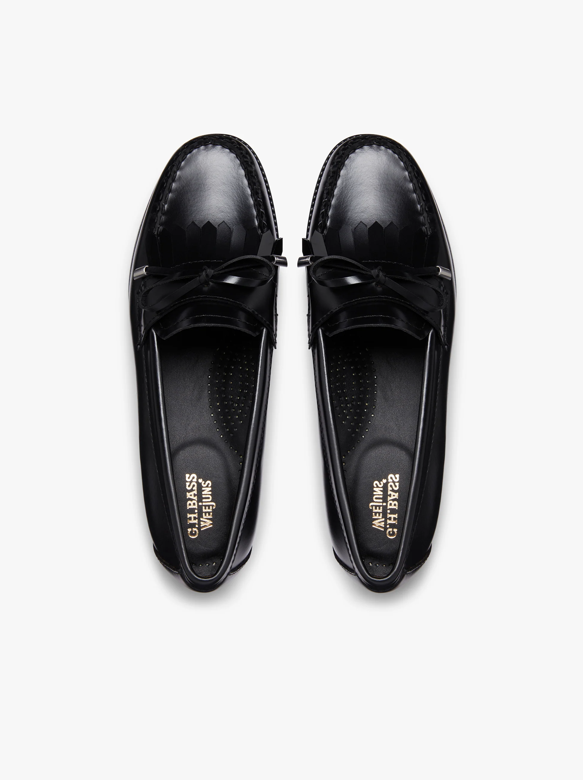 Introducing the Easy Weejuns Esther Bow. Crafted with from a premium black moc leather, these loafers redefine elegance with every step. A dainty bow delicately adorns the vamp, adding a touch of charm and femininity to the classic silhouette. Paired with a playful fringing detail, these loafers are a must-have addition to your wardrobe. Try pairing with tailored trousers and a crisp blouse for a chic office look or with a tailored jumpsuit for a sophisticated yet playful vibe.