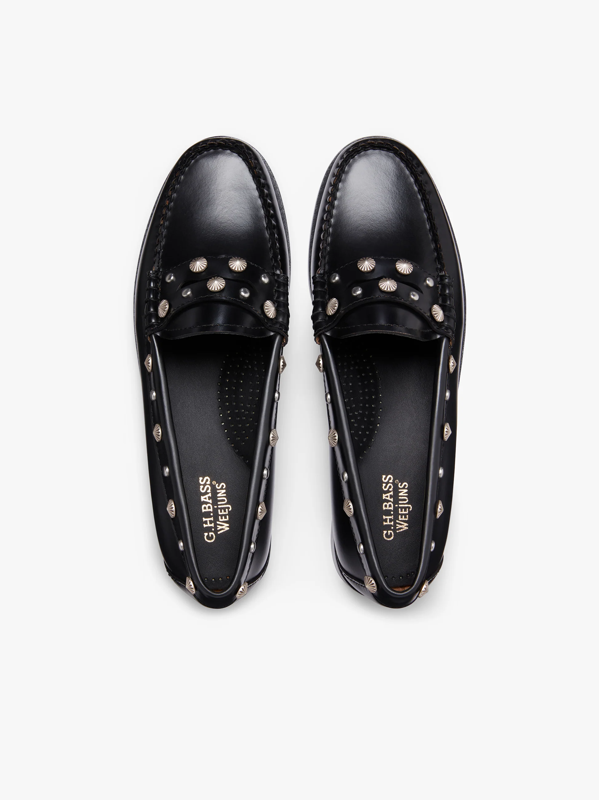 The Weejuns Penny Stud, a penny loafer infused with subtle western inspiration. Crafted from supple black leather with a polished finish. It's the details that truly set these studded loafers apart. Chrome studding not only adds a touch of edgy allure but also fortify the construction, ensuring durability without compromising on style. Slip into these loafers effortlessly with their easy slip-on design, perfect for a lifestyle on the go. Featuring a strong welt stitch for added resilience and subtle embossed bottomsole branding for a hint of luxury, these shoes are as durable as they are stylish. Finished with a flexible polished leather outsole. A loafer where classic elegance meets modern edge.